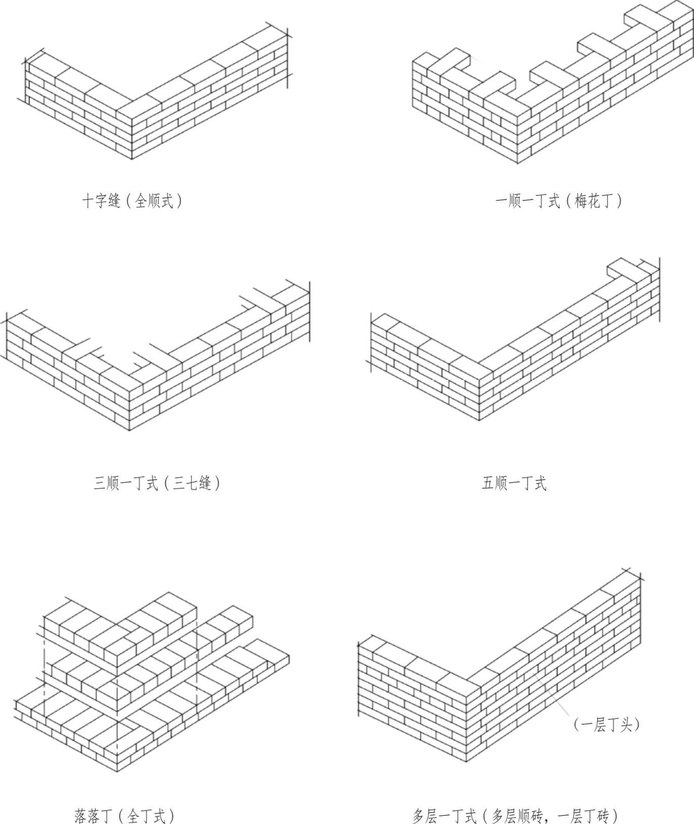 在砖墙的砌筑中,把砖的长身方向垂直于墙面砌筑的砖叫丁砖,把砖的长身方向平行于墙面砌筑的砖叫顺砖,上下皮之间的水平灰缝称为横缝,左右两块砖之间的垂直缝称为竖缝。古建筑墙面常用的组砌方式有十字缝、一顺一丁、三顺一丁、五顺一丁、落落丁(全丁式)、多层一丁(多层顺砖,一层丁砖)(图 2-4)。