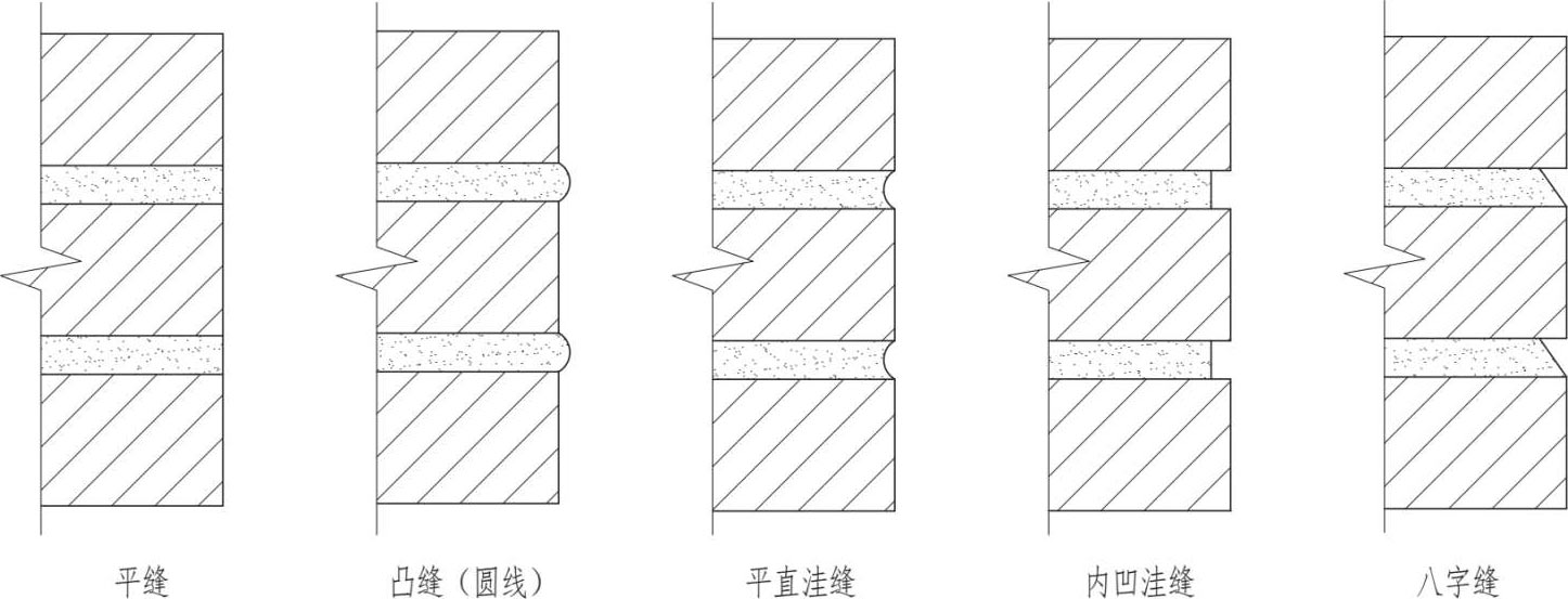 仿古建筑墙面灰缝有平缝、凸缝、凹缝三种。凸缝又称鼓缝,砖墙凸缝常做成圆线。凹缝也称洼缝,又分为平直、内凹和八字缝(图 2-5)。