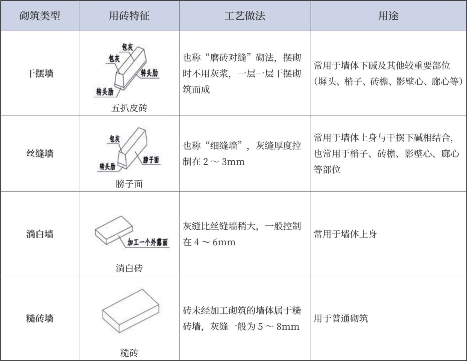 砖墙的砌筑类型主要有干摆墙、丝缝墙、淌白墙和糙砖墙(表 2-1)。
