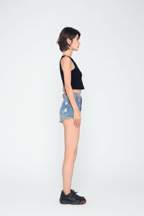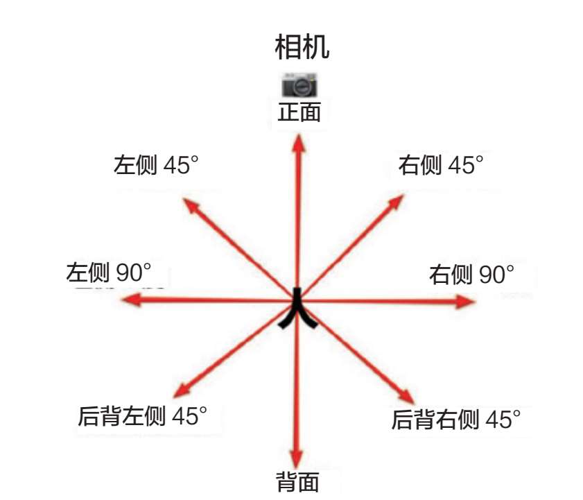 拍摄时,模特应从多个方位和角度来动态呈现自己的动作,即正面、左侧 45°、右侧 45°、左侧 90°、右侧 90°、后背左侧45°、后背右侧 45°,以及背面。