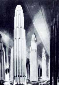 与此同时,欧洲先锋派建筑师们梦想着创造一种“发光的建筑”,让光真正成为一种建筑材料;他们想象着发光的结构,在这种结构中,光与空间将成为新的设计语言。当时只有少数评论家意识到建筑照明的巨大潜力,其中最有影响力的是道格拉斯·哈斯克尔(Douglas Haskell),他在1931年称:“千百年过去了,建筑风格变了又变,但这些都没有20世纪电灯发明的影响大,其影响力甚至将超过钢材、玻璃和混凝土这个传统的‘建筑铁三角’ [4] 。”令哈斯克尔印象最深刻的是著名建筑概念艺术家休·费里斯(Hugh Ferriss)于1929年出版的《明日都市》一书中所描绘的景象,在费里斯的书中,未来的美国都市将笼罩在模糊的夜雾中,高耸的摩天大楼矗立在强劲的灯光中。