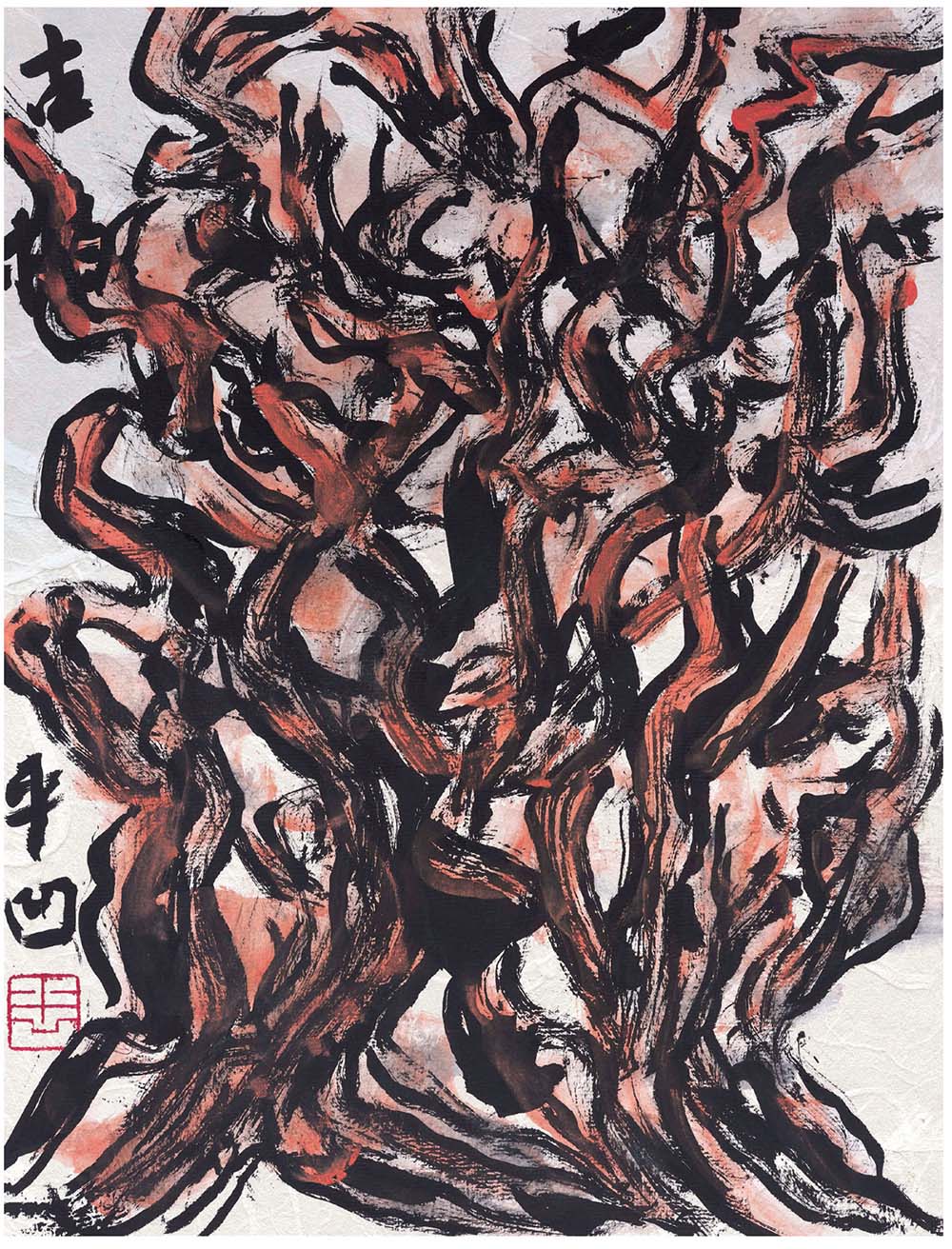 主任安排我住在小院,这是他们的生活区。小院因要避着树,院墙就弯来拐去,极不规则。北面八间屋,三棵樟树就斜倚着屋檐,一旦起风,树干就磨着檐板,咕嘤咕嘤像在扯锯。西边屋四间,一棵红豆杉看着是破屋顶而出,树冠浓重,把屋顶全部覆荫。东边屋五间,四间一体,屋后两棵柏,颜色褐黄,枝丫稀疏,其朵如掌。然后独立一间,就是灶房。院子里还有五棵松,一棵在东院墙角的厕所门口,一丈多高就平着长,上面可睡人。一棵从那块平面巨石下出来,只有杯口粗,却端直向上,枝叶像是撑了把伞。前院墙南角原本是个小崖,石缝里一棵顺着崖往上长,一棵却弯下来,都不大,但躯干扭曲,色成铁青。院门口其实没安装门,外边就站着两棵橡树,一搂粗的,枝股舒长了直垂在地面,似做迎客状。白天里,阳光透过松枝,阳光就是一道一道或粗或细的光柱,我和主任的学生在石头上下棋,有白头鹎飞来,在松树枝上鸣叫,而院门外正默默走过两只麂子。麂子没有盗窃意,白头鹎没有机械心,主任的学生不理会,我也就不理会。不理会的不仅是白头鹎和麂子,院子外的凹坳里还有狍子、白眉子、林麝、獾、狐狸和刺猬。鼯鼠和竹鼠常常就在北屋的台阶上,它们都是鼠并不是同类,却一块站起来了,你在看我,我在看你,还相互行礼作揖。羚牛出现在远处的草地上了,那是莲山最大的动物,或许长得太怪异吧,自尊而又自卑,从不靠近楼和小院。两只黄羊又在土丘上打架,牴角碰得咚咚响。而熊猫是野生动物中的君子,永远的孤寂,要么仰躺着吃竹子,它一天有八个小时都在吃竹子,要么去树杈上睡觉,那么笨重的身子,会从树杈上掉下来的,但从没掉下来。最不安分的是成群的猴子,小脸长尾,一身金毛,总是爬高窜低,嬉闹不止,动不动还给人亮个腚。研究站一日三餐,主食是米面,做起来花样繁多,菜是从野外采回来的蒿笋、马齿苋、木耳、马兰头、蕨芽、枸杞尖、辛菇、刺芹,或煮或炒,热烫凉拌。主任说:“啊有人吃营养,咱们吃味道。”我喜欢吃荞面饸饹,遗憾吃不到。晚上了,那里的黑比城里的黑要黑,是瞎子一样的黑,研究站的人员各有一个手电筒,能装四个电池的。我没有手电筒,不可以去院门走动,待在屋子里点蜡看书,窗户就一直砰砰响,是灰蛾、飞蚂蟥、锥蝽、蠓子、黄蜻、金蜂、蝴蝶、蓟马、金龟子飞撞而来,玻璃上就黏黏糊糊厚厚实实了一层。睡下了,涛声很大,原以为水会起涛,殊不知树也起涛,始终一个节奏,天摇地动的,就想象着莲山该是巨轮,自己就在海上。半夜里起来上厕所,天上出了星星,灵光攒动,黑的颜色浅了些,能摸着树木,琢磨这星星是扎根在光明吗,树木扎根在黑暗。厕所竟然一半悬在涧外,蹲坑就是两块分开的木板,风从木板间上来,刀子般地割屁股。返回屋再睡下,还想着粪便下去能落到涧底吗,这不是像乘飞机吗,哑然而笑。