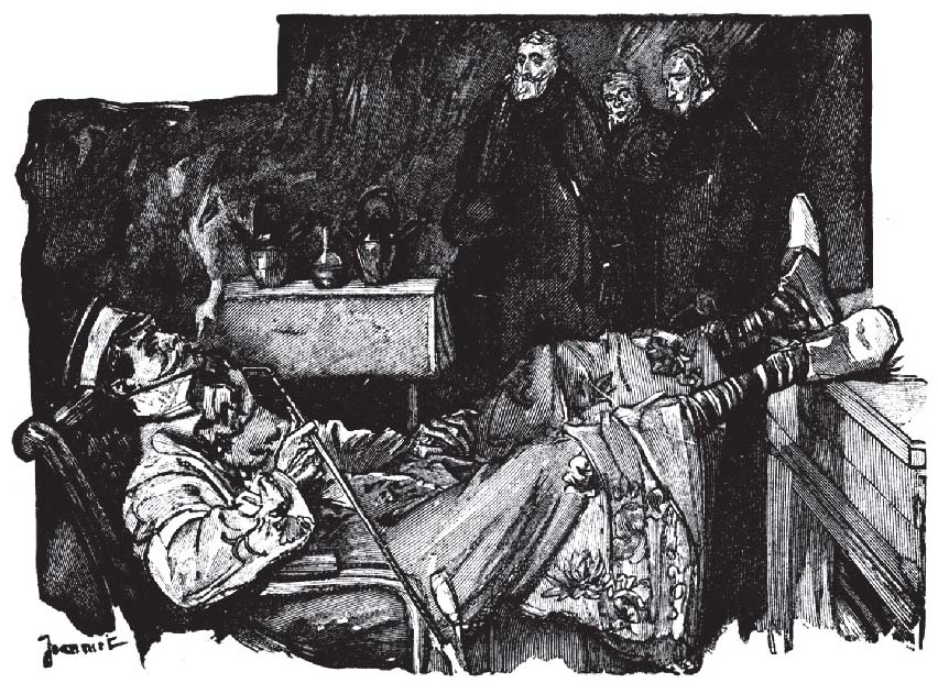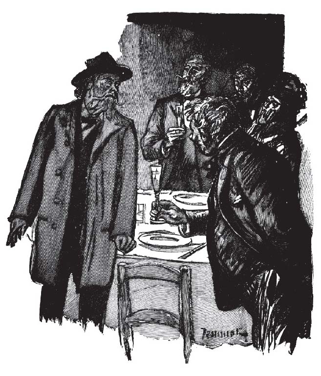 科尔纽岱始终没说一句话,也没有一个动作;他仿佛沉浸在严肃的思索中,只偶尔狠狠揪一下自己的大胡子,好像要把它拉得再长些似的。最后,将近午夜的时候,大家要散了,已经踉踉跄跄的鸟先生忽然过去轻轻拍了拍他的肚子,含混不清地对他说:“今晚,您……您不大开心啊;您一声也没吭,公民。”不料科尔纽岱猛地抬起头,两眼凶光闪闪地扫视着这帮人,说:“我告诉你们,你们刚才干的事简直卑鄙透顶!”他站起身,走到门口,又说了一遍,“卑鄙透顶!”便走了出去。