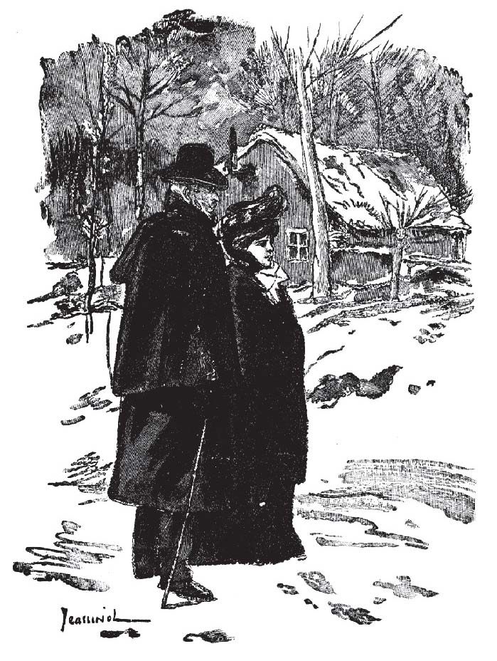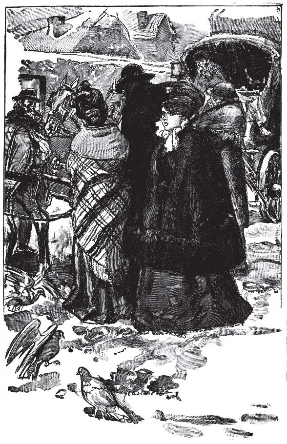 第二天,冬日明亮的阳光把白雪映照得晶莹夺目。公共马车终于套好了,等候在门前。一大群白鸽,粉红的眼珠黑瞳孔,脖子缩在厚厚的羽毛里,正大模大样地在六匹马的腿底下踱来踱去;为了寻找食物,把还冒着热气的马粪啄得满地都是。