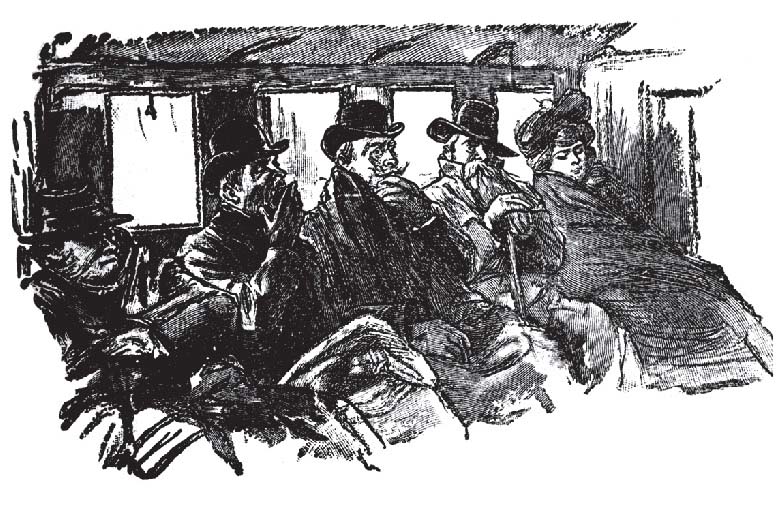 车夫裹着他那张羊皮,坐在车前面的座位上抽着烟斗。旅客们个个喜笑颜开,催着快给他们包装好下一段旅程的食品。