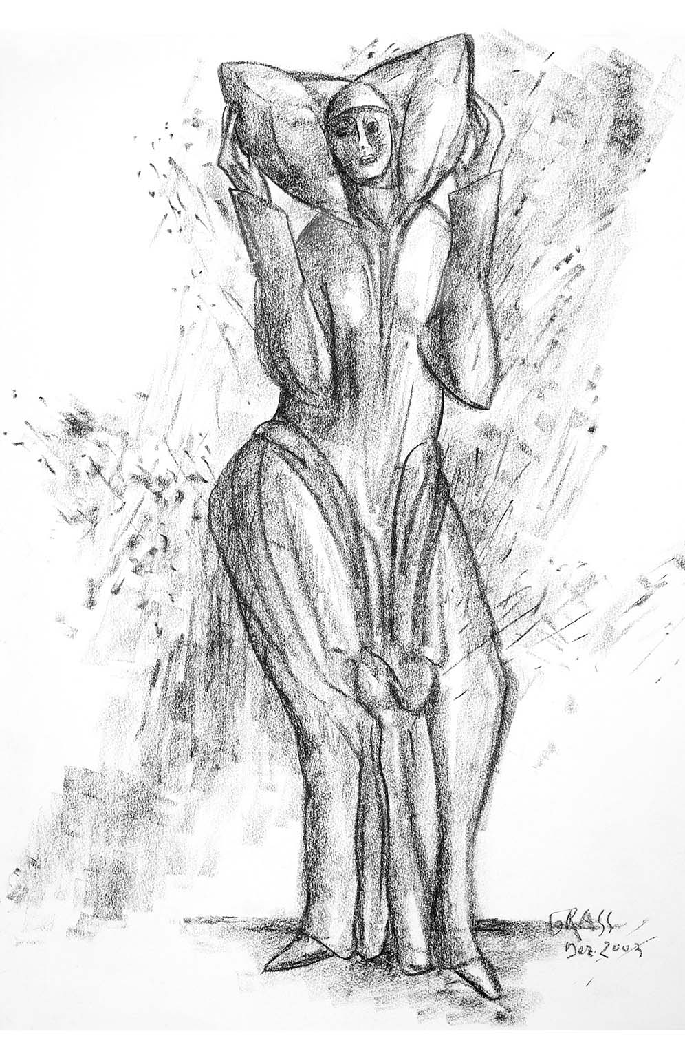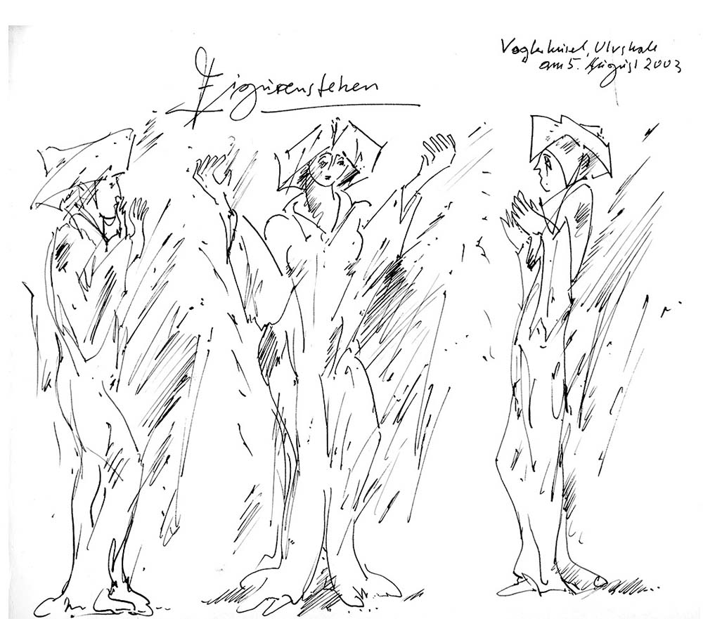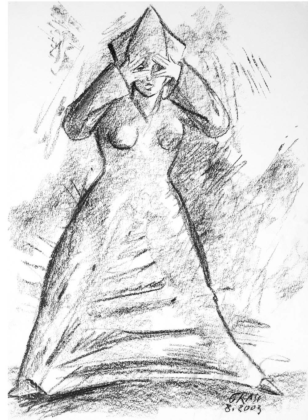 她扮成瑙姆堡的乌塔,直接——即使隔开一点点距离——伫立在科隆大教堂正门前,如此这般,所有常去做礼拜的教徒或只想进教堂观光的游客不得不从她左边或右边擦身而过。她从头顶的冠冕到足尖一身灰色,或用喷雾盒均匀地微微喷洒变灰,一只小木头箱用来做她站脚的小平台,也被漆成灰色,给人印象如同化石一般。我手里有张照片,也许能比照出:她与原型乌塔一样,左手食指戴着戒指,这个饰品与石刻出来的毫无二致,挺迷惑人的。长及足部的大衣皱褶简朴地垂下,没有早期或晚期哥特式矫揉造作的格调。唯有左手撩起大衣料子的地方妨碍布料的严整挺括,然而在戴戒指的左手下方,布料又平整地垂向地面了。正如众所周知的照片所显示的那样,她用隐藏的右手将大衣领高高竖起,这样,右脸至下巴的圆形曲线、颈部的右侧以及额环下面的头部饰带全都被遮住了。我敢肯定,这无损于她的尊严。