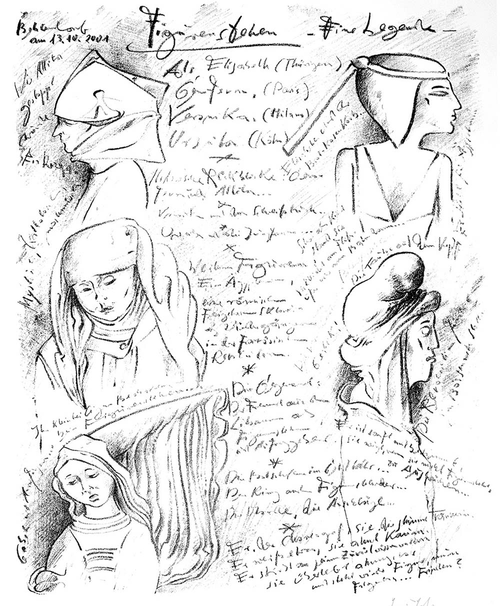 那位与我的乌塔长相很像的雕像模特——不,乌塔就是这模特——手拎一个篮子,篮子也像由石头凿成,里面堆满新鲜的玫瑰花,当然是红色的。它们在给圣女传奇中的玫瑰奇迹画插图哩:图林根有个铁石心肠的伯爵,其妻伊丽莎白违背他的意志,每天拎一篮面包去接济贫者病者和孤儿,伯爵严禁妻子送食物。但她仍旧带着在厨房里匆忙集拢的面包边角和碎块穿过城堡后面的小门行走在半路上,却被伯爵当场逮住,他怒不可遏,扯掉篮子上的罩布,但他瞅见的却是满篮的玫瑰花,那些含苞欲放的、盛开的和生气蓬勃的花朵。伯爵顿感羞愧,从此心肠就不那么硬了,他的妻子也可以给那些食不果腹的人们送面包了,想送多少都行。据说这事发生在几百年前,而今,我的乌塔·封·瑙姆堡进入这一传奇角色,纵然她未被封为圣女。