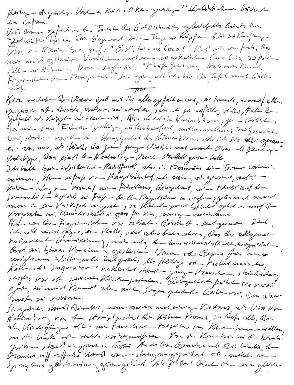 我也未能免俗,当我在由多个恣意“游戏”部分组成的米兰大教堂正面墙前见到她顶着闪烁炽热的南部阳光,她这个北方女子显得多么怪异,于是一个问题就使我全身发痒:她看到什么了?认识到什么了?惧怕什么了?她在回顾中见到了最后一批斯陶芬人——康拉丁纵马驰骋!——与非洲干旱地区数百万忍饥挨饿的儿童相比,大教堂广场上吃得过饱、肥嘟嘟的鸽子令她生厌了吗?抑或,她在百无聊赖打量着一批批老是身穿同样色泽杂乱的行头的旅行者吗?她为何站在米兰教堂前而非乌尔姆大教堂前——我寻找她的地方呢?