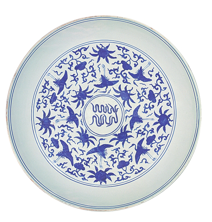 明嘉靖·青花芝桃仙鹤符箓纹盘