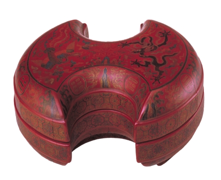 此盒通体朱漆地,饰以戗金彩漆纹,盒形似银锭,盒上图案包括龙凤、珊瑚、海水江崖、“万”字纹、八卦纹等。