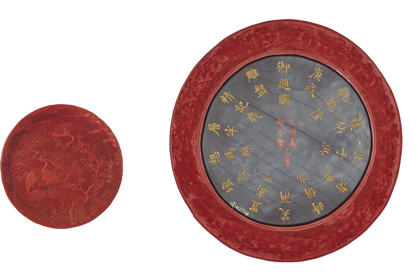 明嘉靖·剔红松竹梅鹤纹圆盘