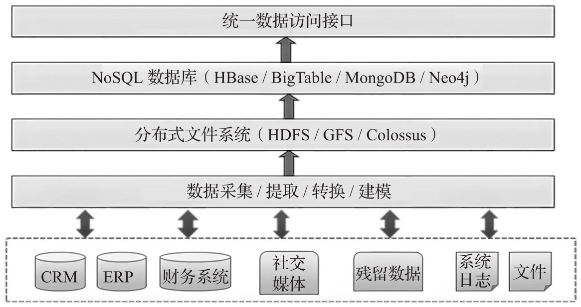 数据采集层的数据来源包括应用系统,如客户关系管理(Customer Relationship Management,CRM)系统、企业资源计划(Enterprise Resource Planning,ERP)系统、财务系统等,还有社交媒体数据、残留数据(即在线行为和与数字设备交互的副产品,而不是用户特别选择留下的信息)、系统日志、文件。使用网络爬虫、无线传感器网络、物联网和各种数据资源,可以从中采集进行分析所需的原始数据。
