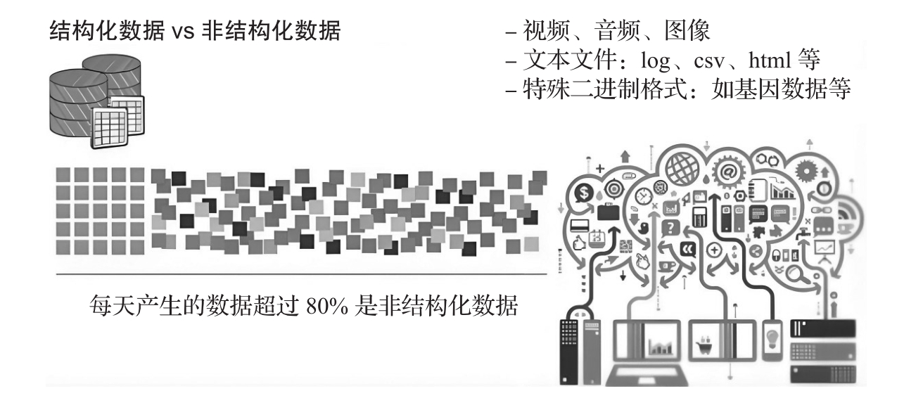 顾名思义,非结构化数据就是没有固定结构的数据。所有格式的办公文档、文本、图片、各类报表、图像和音频/视频信息等都属于非结构化数据。对于这类数据,一般直接整体进行存储,通常存储为二进制的数据格式。典型的人为的非结构化数据包括文本文件(如电子表格、演示文稿、电子邮件等)、社交媒体(如新浪微博、微信、QQ等)数据、移动数据(如短信、位置等)、多媒体数据(如照片、音频、视频等)等,典型的机器生成的非结构化数据包括卫星图像(如天气、地形等)、科学数据(如石油勘探、大气数据等)、监控数据(如监控照片、监控视频等)、传感器数据(如交通、天气、海洋等)。
