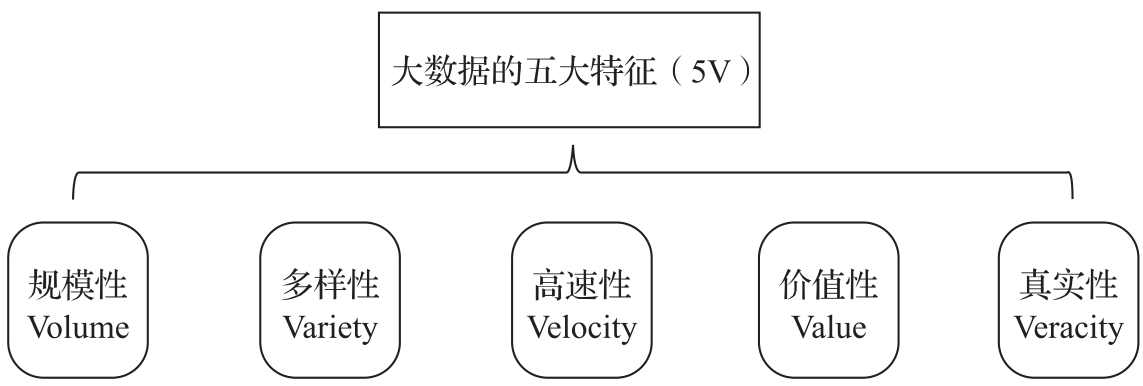 虽然大数据的定义尚未统一,目前存在的定义多而杂,不同的企业、行业都从自身角度来定义大数据的概念,但主要都体现在数据集规模上。目前业界广泛接受的定义,是由国际知名咨询公司IDC提出的大数据四个特征,也就是4V特征——规模性(Volume)、多样性(Variety)、高速性(Velocity)以及价值性(Value)。但随着大数据应用的发展,人们发现数据规模并不能决定其是否能为决策者提供帮助,数据的质量和真实性才是成功决策最坚实的基础。所以衍生出了一种比较主流的说法,即由IBM提出的5V特征,在4V特征的基础上增加了数据真实性(Veracity)。这一特征强调了数据质量的重要性,以及大数据应用面临的巨大挑战。图1-2介绍了大数据的五大特征。