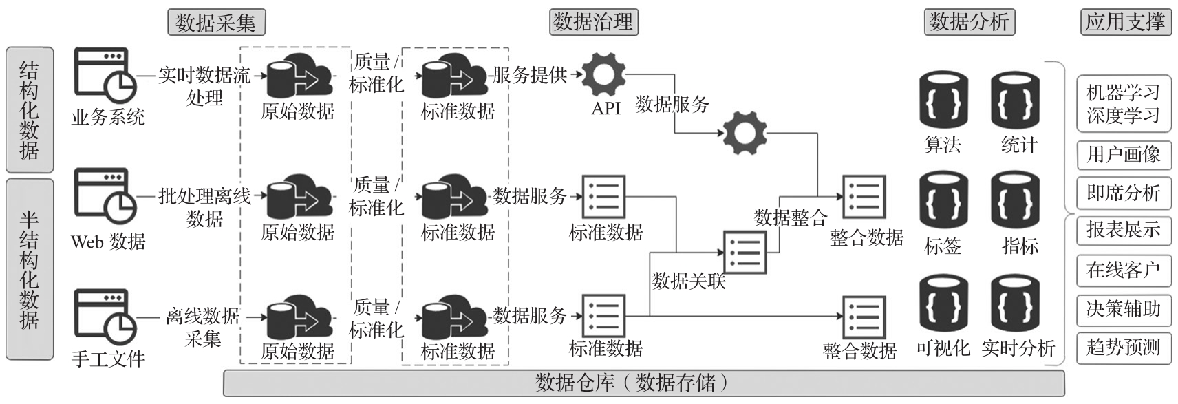 在数据治理阶段根据数据质量和应用场景需求,对所采集的数据进行数据转换,如数据去重、异常处理和数据归一化等,使得不同来源的数据整合成一致的、适合数据分析算法和工具读取的数据。形成标准数据后,将它们存储到数据仓库或者统一数据存储的标准数据层中,并根据场景需求将数据整合形成数据服务对外提供。