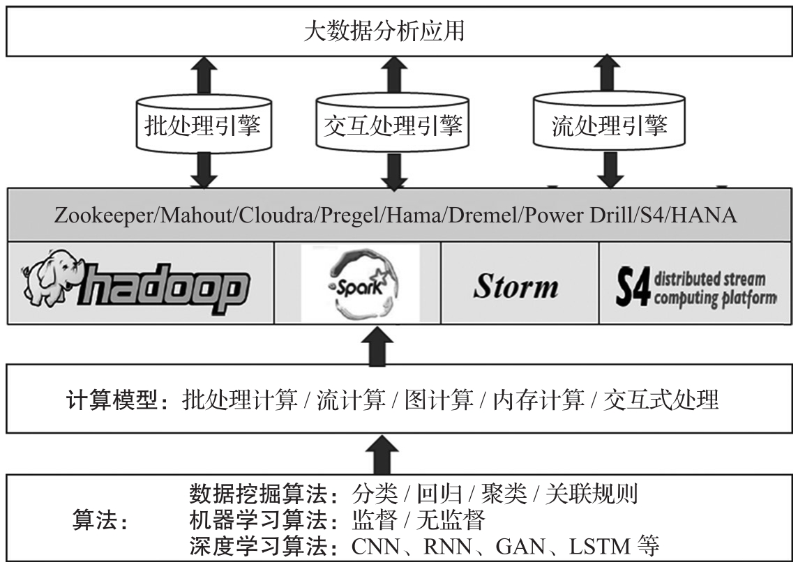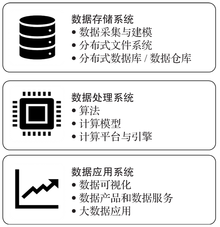复杂的大数据系统包含各种不同的技术、模型和应用,这里从本质上把大数据的计算架构分为三个基本系统,即数据存储系统、数据处理系统及数据应用系统,大数据的计算处理不仅涉及各类数据分析及挖掘算法,其计算系统的性能还依赖于计算模型和计算架构。