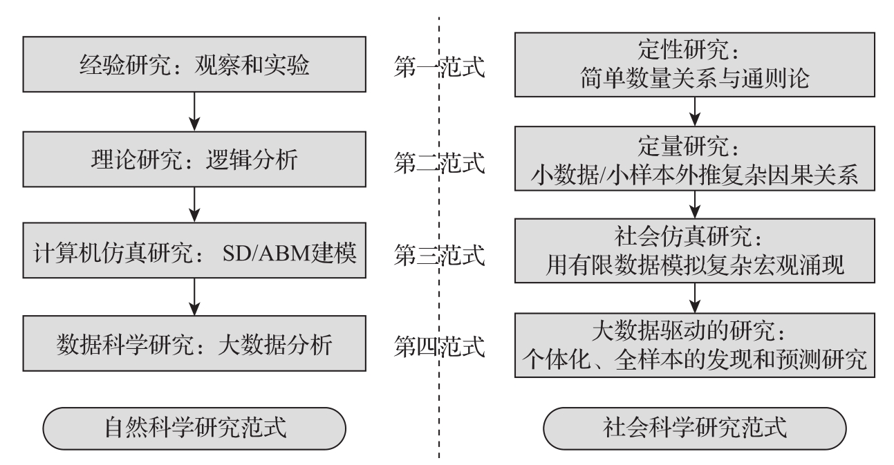 科学的未来发展趋势是随着数据的爆炸式增长,计算机不仅可以进行模拟,还可以进行分析总结、产生理论。数据密集型范式逐渐从第三范式中分离出来,成为一种独特的科学研究范式,这种科学研究方法被称为第四范式。基于数据科学的大数据研究范式是最近10余年来随着ICT技术不断发展、互联网的兴起和实时在线数据的易得形成的第四研究范式。由于“万物皆智能”“万物皆联网”引发了“万物皆数据”,出现了“计量一切”的趋势。社会科学研究的对象也从传统的人参与的社会系统和社会过程,转变为现实世界和虚拟世界平行系统互动形成的数据网络。由于大数据记录了人们日常活动的行为甚至情感偏好,很大程度上解决了社会科学研究中数据采集的“观察渗透”问题,并可通过“数据清洗”和“数据脱敏”解决数据质量和伦理问题。大数据驱动的第四研究范式将改变传统的假设驱动的研究方法,转向基于科学的数据挖掘研究方法,会在预先占有大量数据的基础上,通过计算得出之前未知的理论。