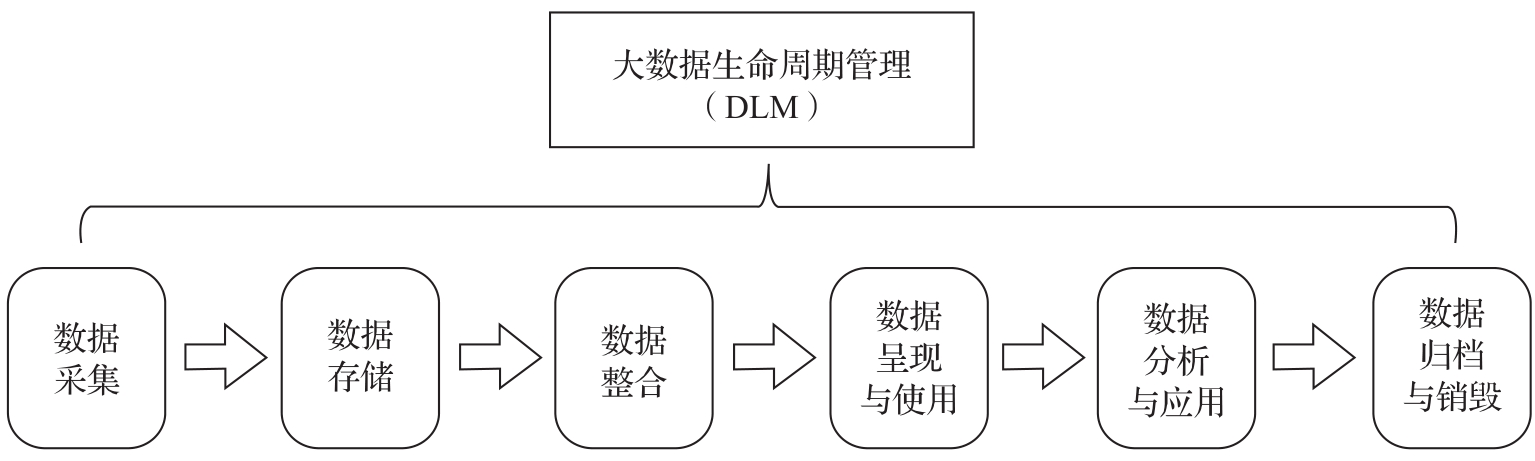 本节从数据生命周期的角度介绍数据集从产生或获取到销毁的过程。如图1-4所示,大数据的生命周期管理可分为:采集、存储、整合、呈现与使用、分析与应用、归档与销毁几个阶段,对数据的管理贯穿在大数据的整个生命周期内。