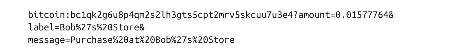 与仅包含比特币收款地址的二维码不同,收款码其实是一个统一资源标识符(Uniform Resource Identifier,URI),里面包含了收款地址、支付金额和备注。这允许比特币钱包应用程序预先填好相关信息,在发送支付请求时,能给用户呈现更好的人机交互。你可以用一个比特币钱包应用程序扫描这个二维码,来看看Alice会看到的信息