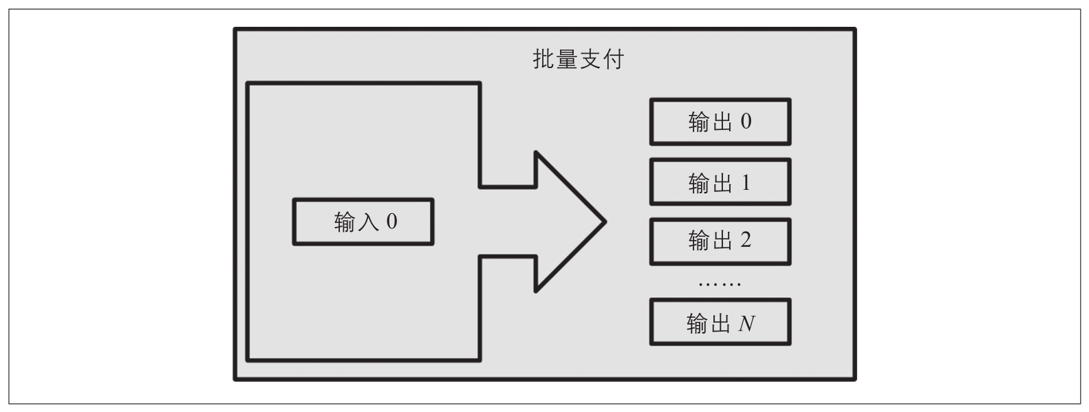 最后一种区块链上常见的交易形式是批量支付,它向多个收款方生成多个支付输出(见图2-6)。这种类型的交易有时被商业实体用来分配资金,例如向多名员工支付工资。