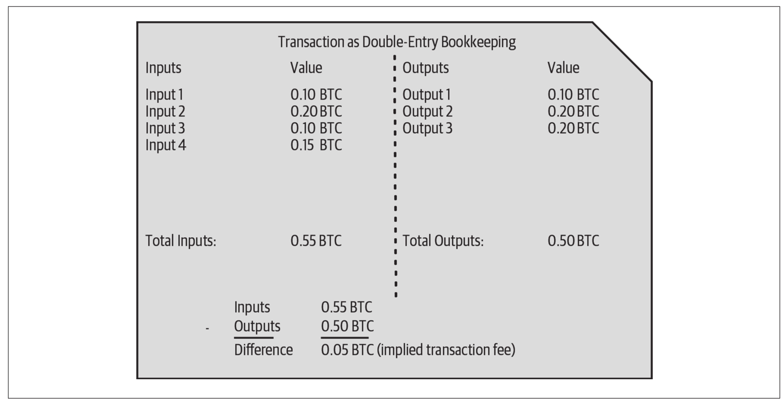 交易就像复式记账法账簿中的账目条目。每笔交易包括一个或多个输入,就像借项。在交易的另一方,有一个或多个输出,就像贷项。输入和输出的总额(借款额和贷款额)并不一定持平。通常,输出的总额要略小于输入总额,二者之间的差额代表了一种隐含的交易手续费。这笔小额费用由矿工收取,矿工负责将这笔交易记录在账簿里。图2-2展示了账簿中的一笔比特币交易。