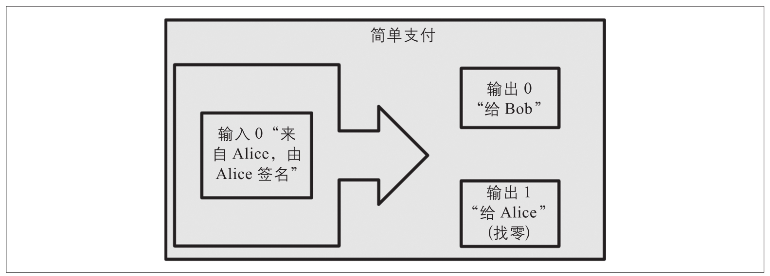 一种常见的交易形式是简单支付。这类交易有一个输入和两个输出,如图2-4所示。