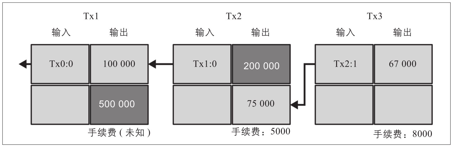 如图2-3所示,实际的比特币交易的输入并不包含具体的金额。为了确定输入的金额,程序需要使用输入的引用来检索正要被使用的前一个交易的输出。