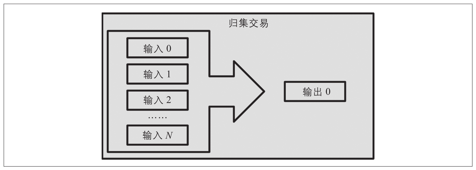 另一种常见的交易形式是归集交易,它将多个输入合并为单一输出(见图2-5)。这相当于现实世界中用一堆硬币和纸币兑换一张面额更大的钞票。这类交易有时由钱包和商业目的生成,用以合并大量的小额资金。