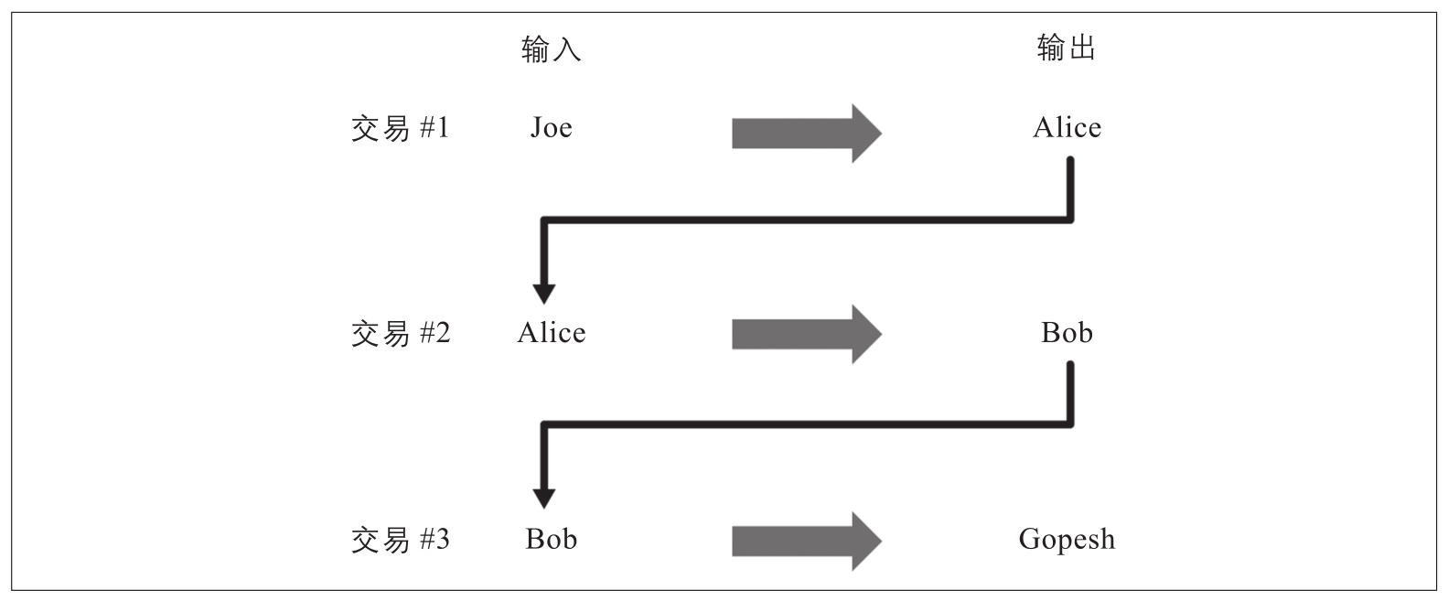 图2-8:Alice的交易作为从Joe到Gopesh的交易链的一部分