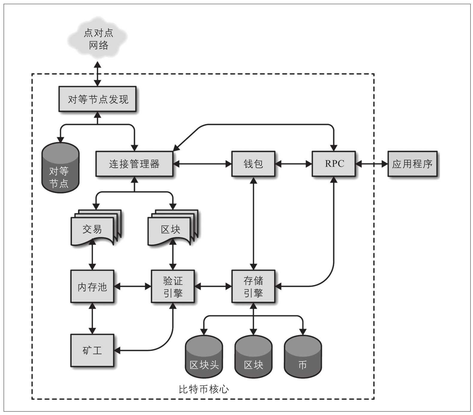 图3-1:比特币核心的架构(来源:Eric Lombrozo)
