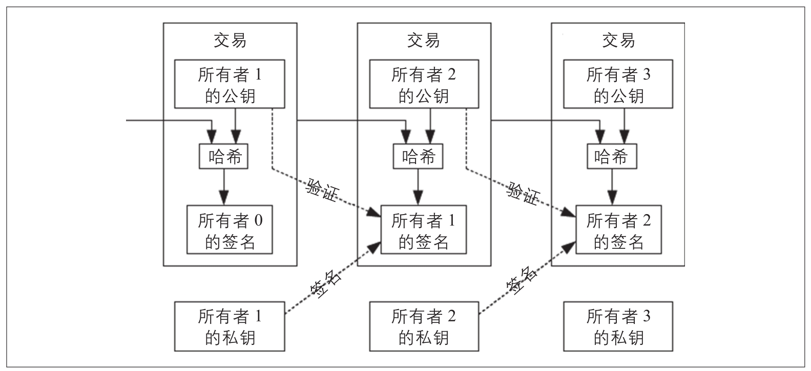 图4-1:原始的比特币白皮书中的交易链