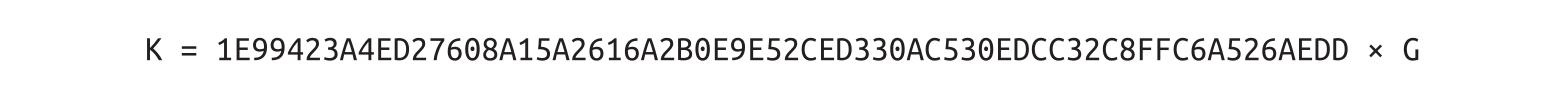 我们在实施椭圆曲线乘法时,将先前生成的私钥 k 与生成元点 G 相乘,来找到公钥 K :