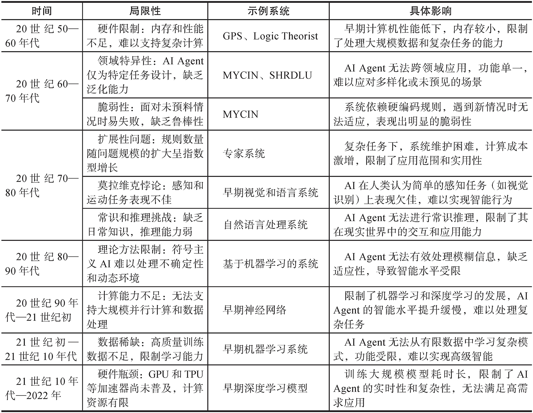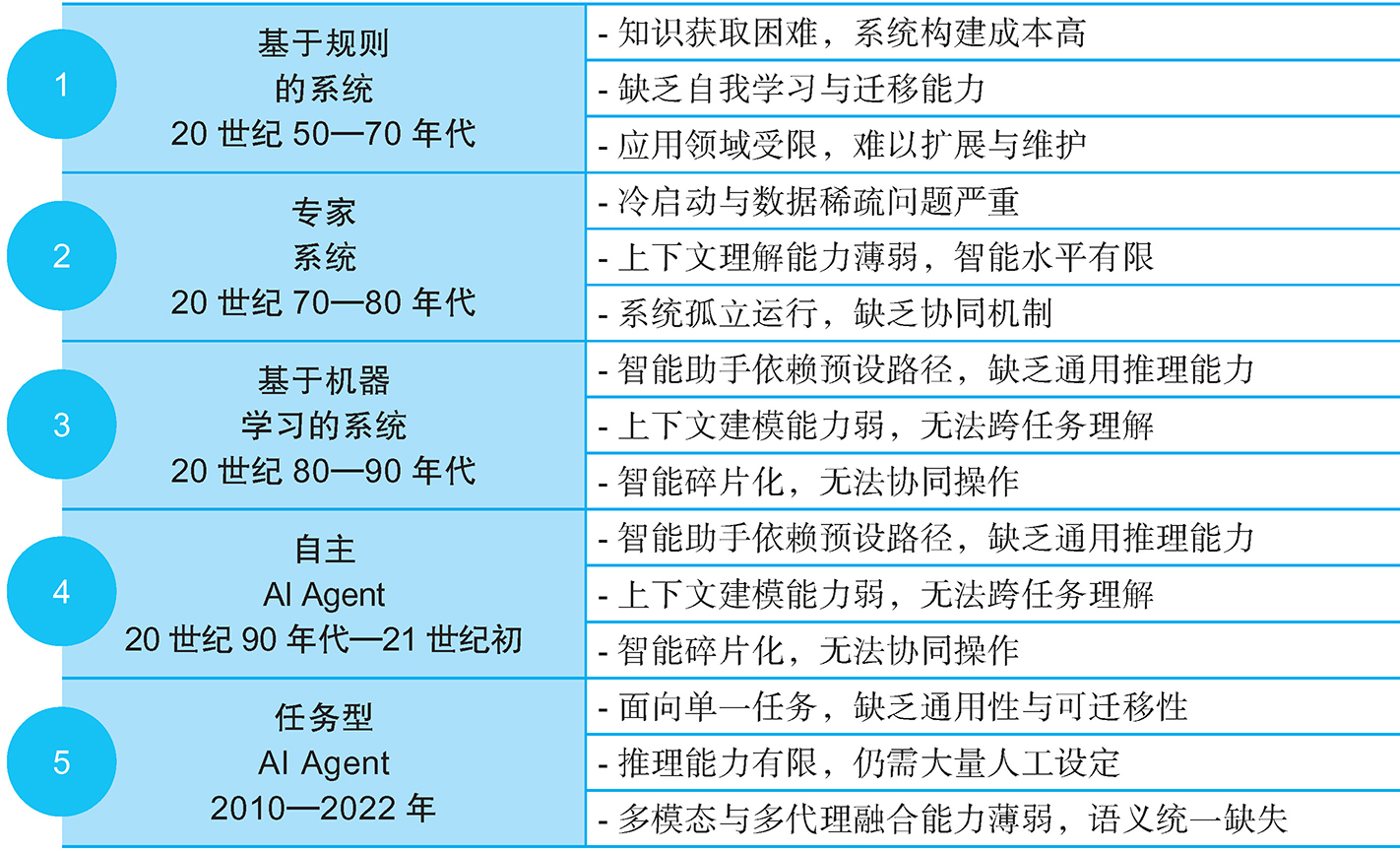 如图1-2所示,经过上述阶段的演进,早期AI Agent逐步从依赖规则的初级系统,发展为具备学习能力、自主决策能力与协作机制的复杂智能体,为现代人工智能技术的落地应用奠定了坚实基础。