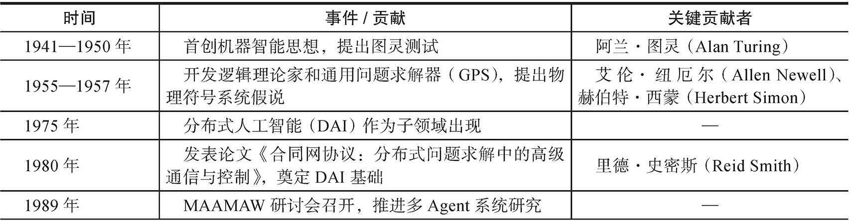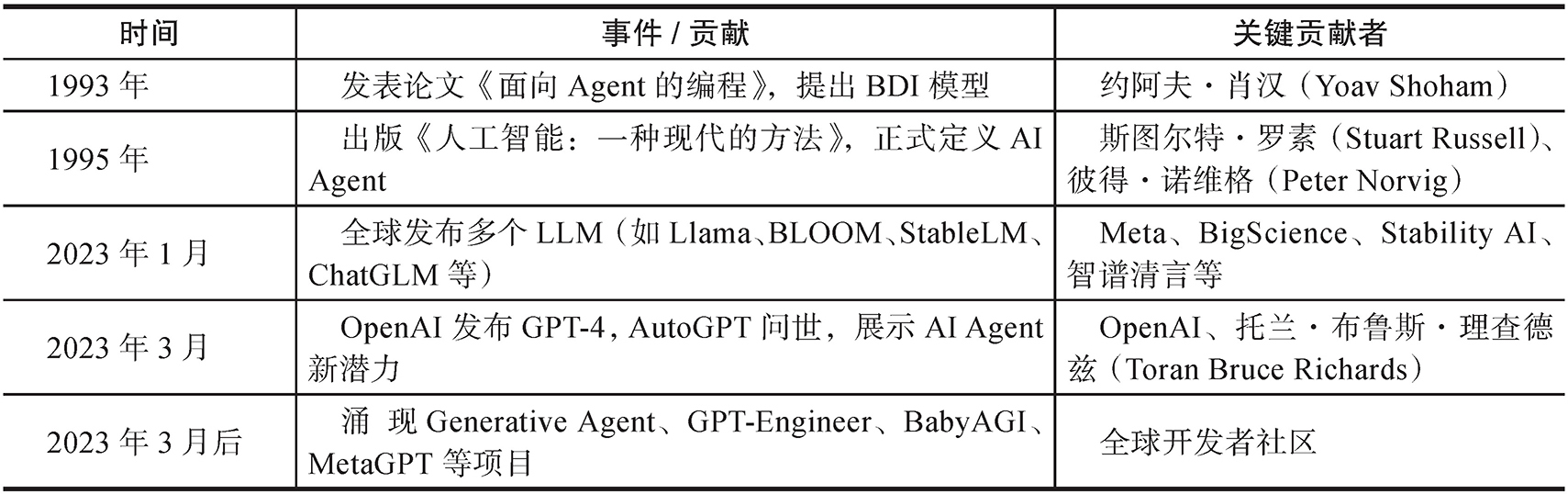 然而,如果我们只关注当下的技术进展,往往会忽视一个关键问题:AI Agent是如何一步步发展到今天的?回顾它的演进历程,不仅有助于理解当前的技术水平,也能为判断未来的发展方向提供重要参考。表1-1列示了AI Agent的发展时间线与关键贡献者。