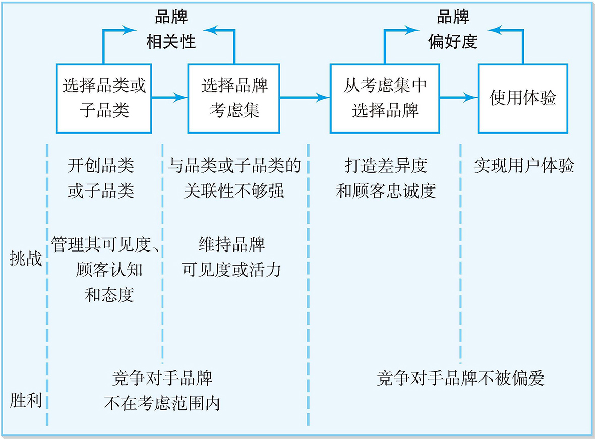 为了更好地理解相关性,考虑一个品牌与顾客互动的简单模式,在这个模式当中,品牌选择包含四个步骤,这四个步骤被分成两个很明确的阶段:品牌相关性和品牌偏好度,如图1-3所示。