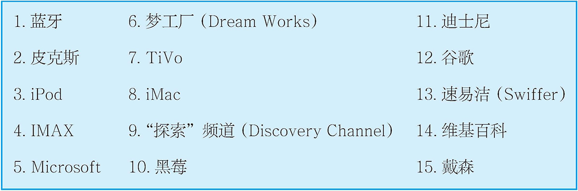如果一个品牌是先行者并拥有新的品类或子品类,它会被认为与创新性有关。获得消费者心中“具有创新能力”这种认知是所有企业的首要任务,因为它为新产品提供了品牌能量和信誉,但很少有品牌能突破并达到这一目标。来自扬罗必凯公司(Young&Rubicam,Y&R)的数据库涵盖了数千个品牌的信息,品牌资产评估者(BAV)就创新性而言对这些品牌进行了排名,2007年排名第1~15名的品牌如图1-5所示。 [8] 几乎每一个品牌都用变革性创新开创了一个新的子市场。