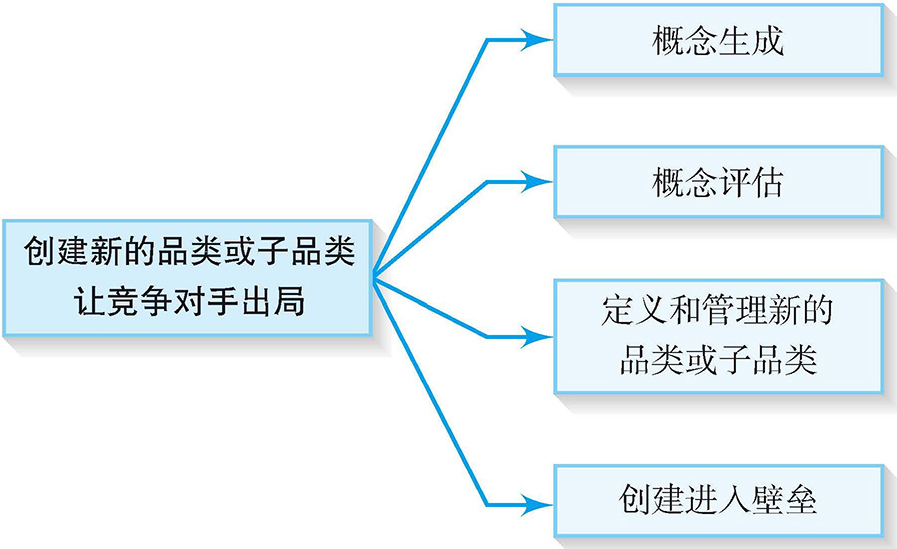 (4)创建进入壁垒。创建进入壁垒是将新的品类或子品类转变为利润来源的最后一步。如果这个利润来源可以持续,结果不仅意味着企业可以获得更多的资源,还意味着更好的营销定位与更强劲的势头。