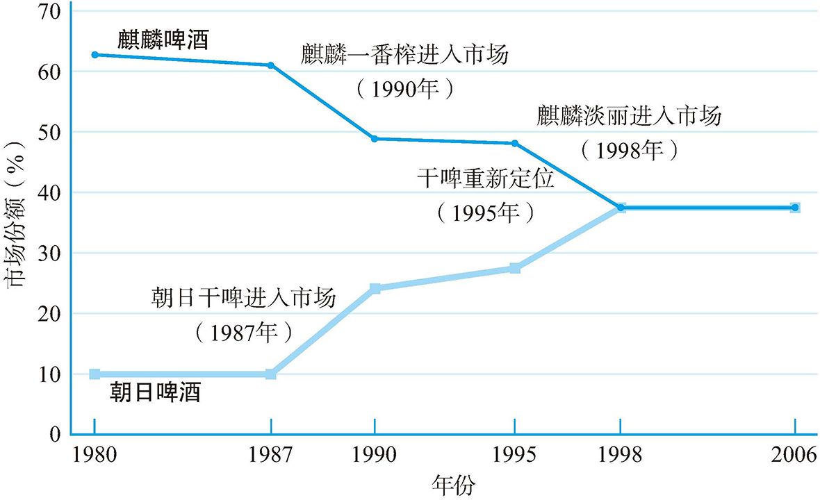 1994年,作为市场唯一干啤品牌生产商的朝日公司,基于其干啤口味清新、日本排名第一以及全球知名的特点,制定了一项非常有力的子类产品定位战略。朝日公司在努力提升其干啤子类产品,与此同时麒麟公司却在破坏其拉格淡啤酒子类产品。也许是被朝日公司“第一生啤”的口号激怒了,麒麟公司也开始转向生啤生产,并且把麒麟拉格更换为“麒麟拉格生啤”[Kirin Lager Draft,原来的拉格淡啤酒更名为“麒麟经典拉格”(Kirin Lager Classic),仍旧在市场上销售,但降级为小众产品]。麒麟公司的本意是利用麒麟拉格生啤加大其对年轻受众的吸引力,但适得其反——它的产品形象变得令人迷惑,导致其核心客户群心生不满。这场1995~1998年发生在拉格啤酒和干啤酒之间的子类产品大战,最终结果是朝日超爽干啤的市场份额增加了8个百分点,攀升至35%,而麒麟啤酒却缩水9个百分点,降至39%。