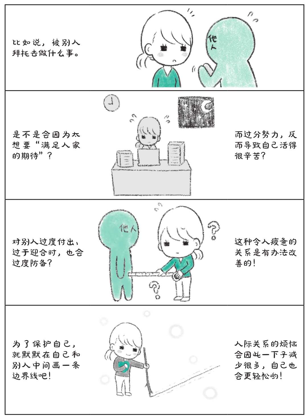 上述种种,其实都是因为自己在与他人交往时找不到“适当的边界感”,才会感到一种喘不上气的苦闷。