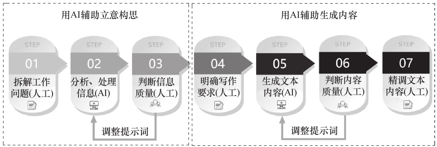 这七步分别是:拆解工作问题→分析、处理信息→判断信息质量→明确写作要求→生成文本内容→判断内容质量→精调文本内容。