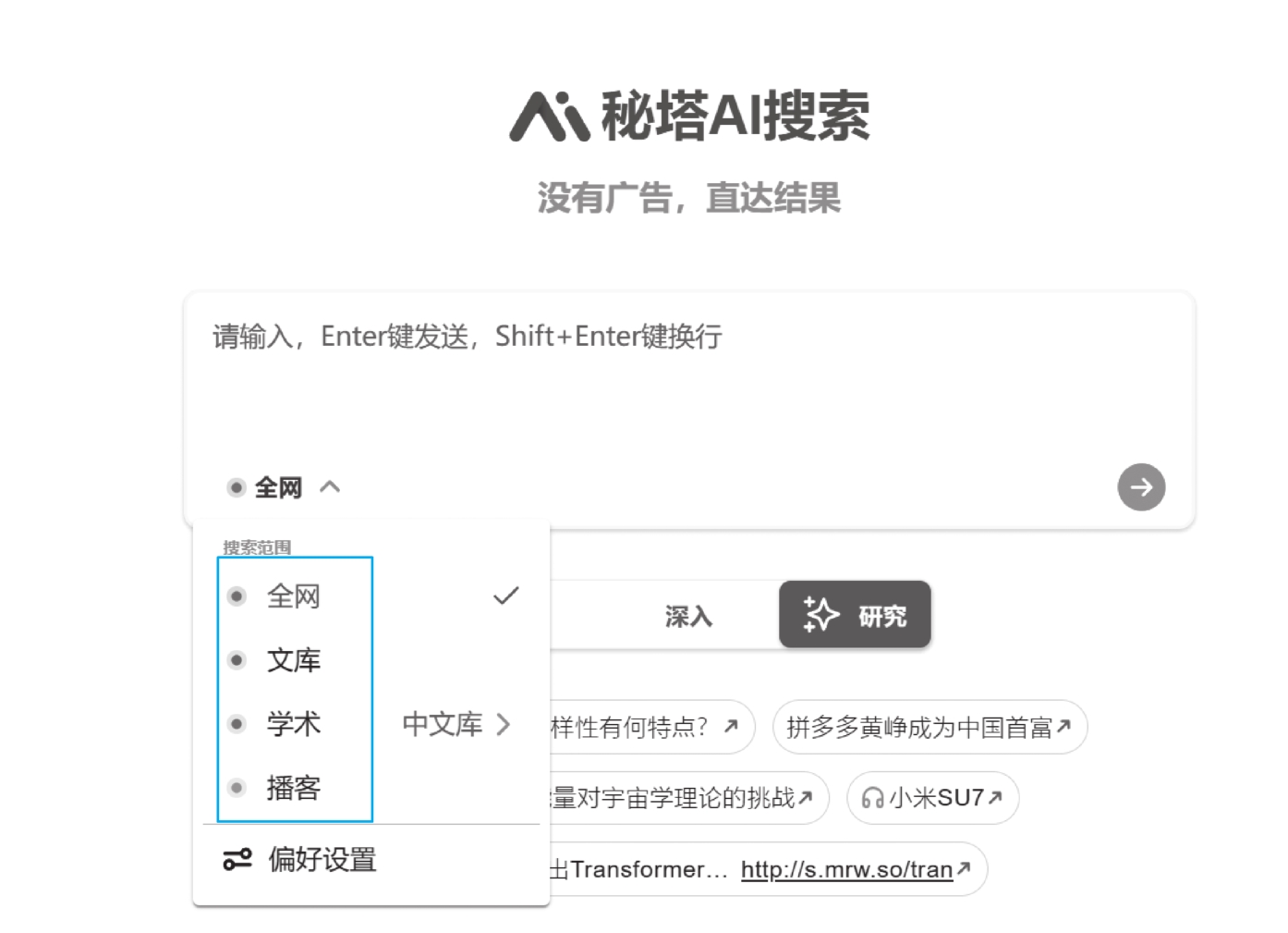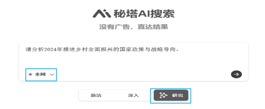 我们把需要研究、分析的问题直接输入秘塔AI搜索的搜索框,这里不需要更多的描述,只输入问题就可以了。