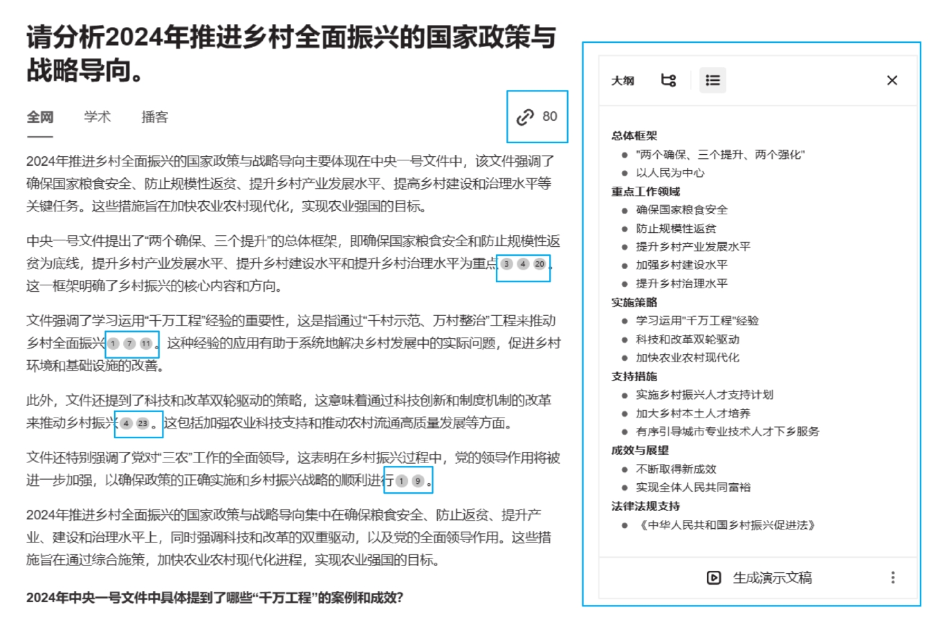 秘塔AI搜索输出示例1,如图1-6所示(部分截图)。