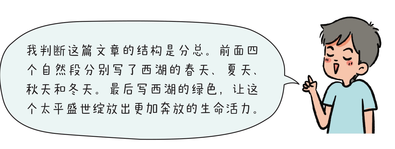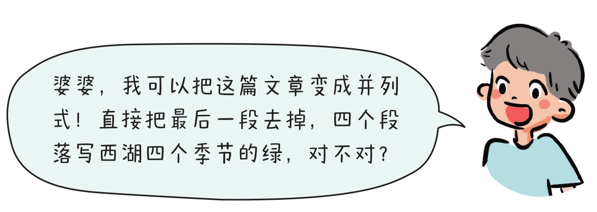 变总分结构,可以把最后一段话放在第一段。先总写西湖的绿色释放出的生命力,再分别写它的四个季节。