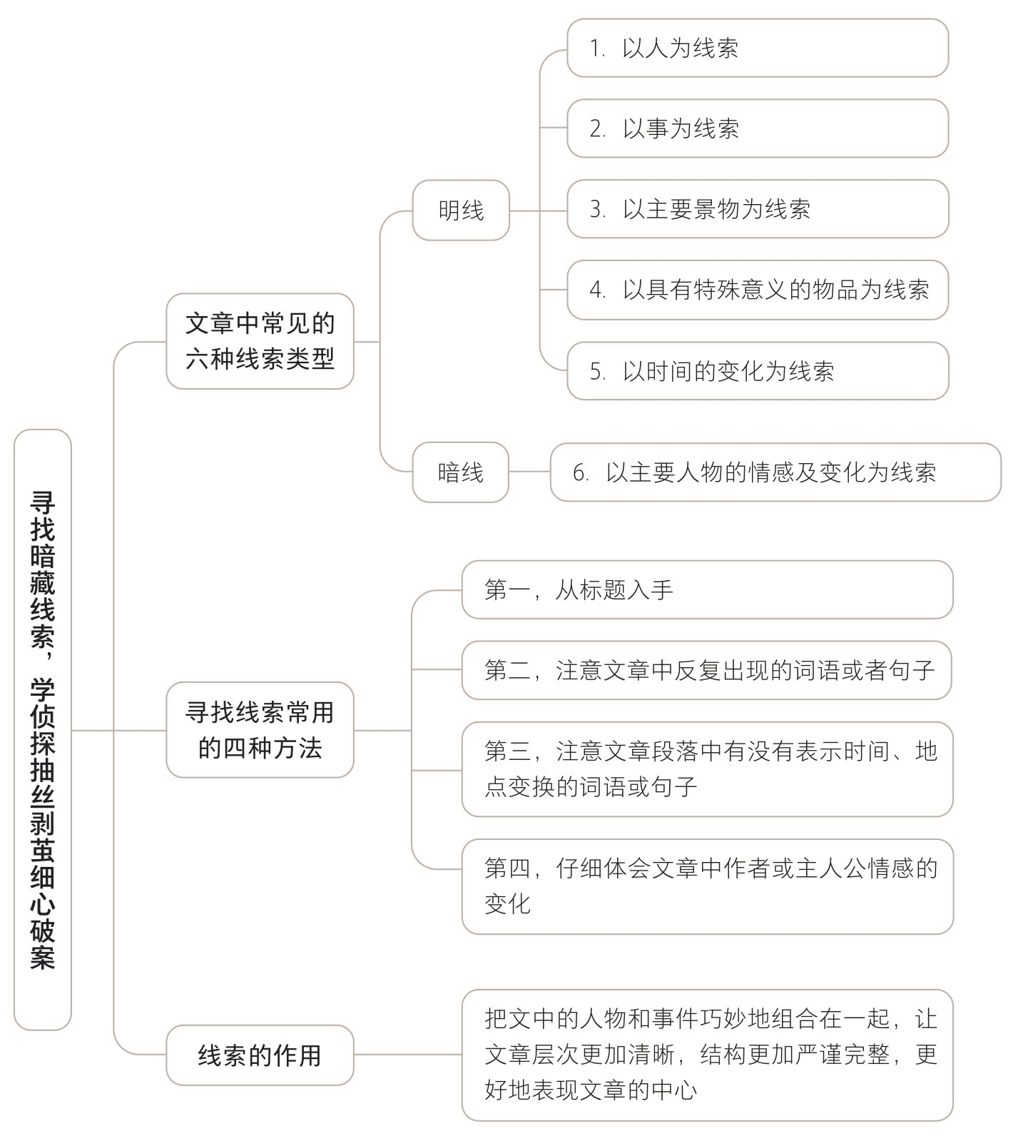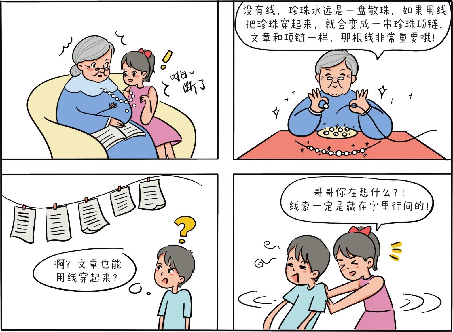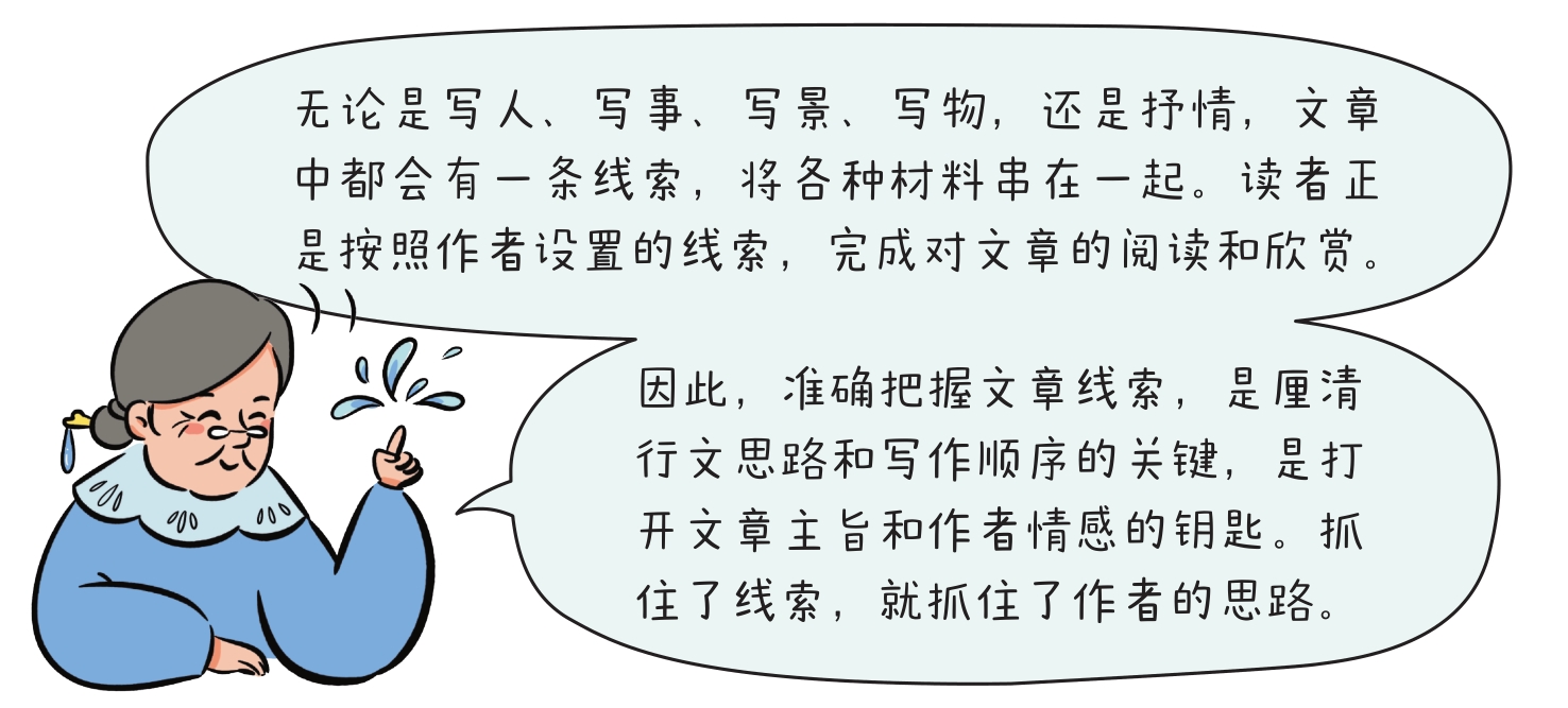 就像婆婆项链上的绳子一样,线索把文中的人物和事件巧妙地组合在一起,让文章层次更加清晰,结构更加严谨完整,更好地表现文章的中心。