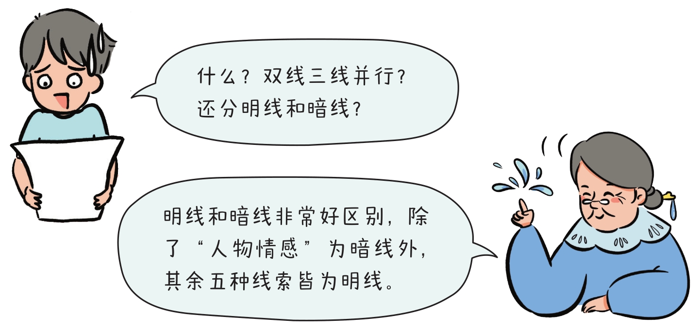 “其实,并不是所有文章都只有一条线索,有的文章是双线甚至是三线并行的。但即使是双线并行,主要线索也只有一条。而且一条线索是明线,一条线索是暗线。”婆婆说。