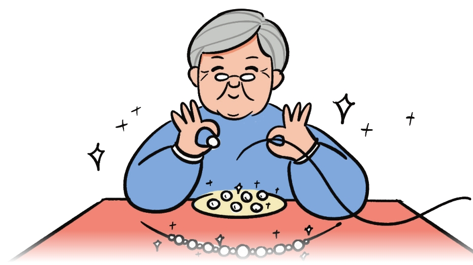 也许是乐嘻嘻的动作太亲密了,一不小心扯断了婆婆脖子上的珍珠项链。珍珠像调皮的孩子一样,蹦蹦跳跳地向房间四处滚去。小朋友们立刻像跳跃的松鼠,追逐着四下躲避的珍珠。不一会儿,珍珠就被聚集到婆婆的手中了。