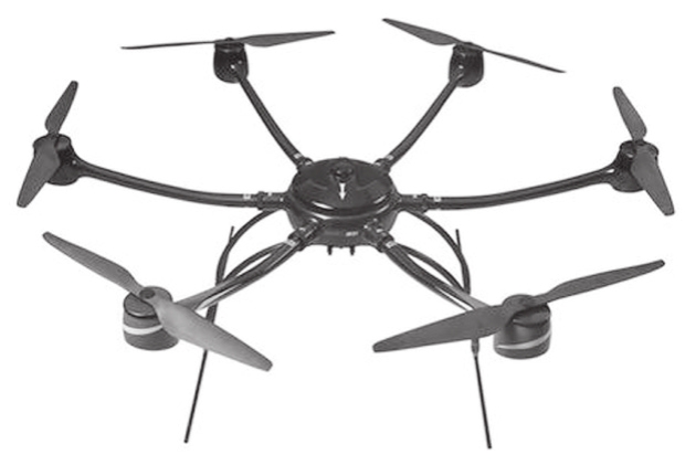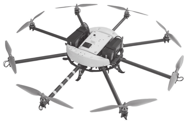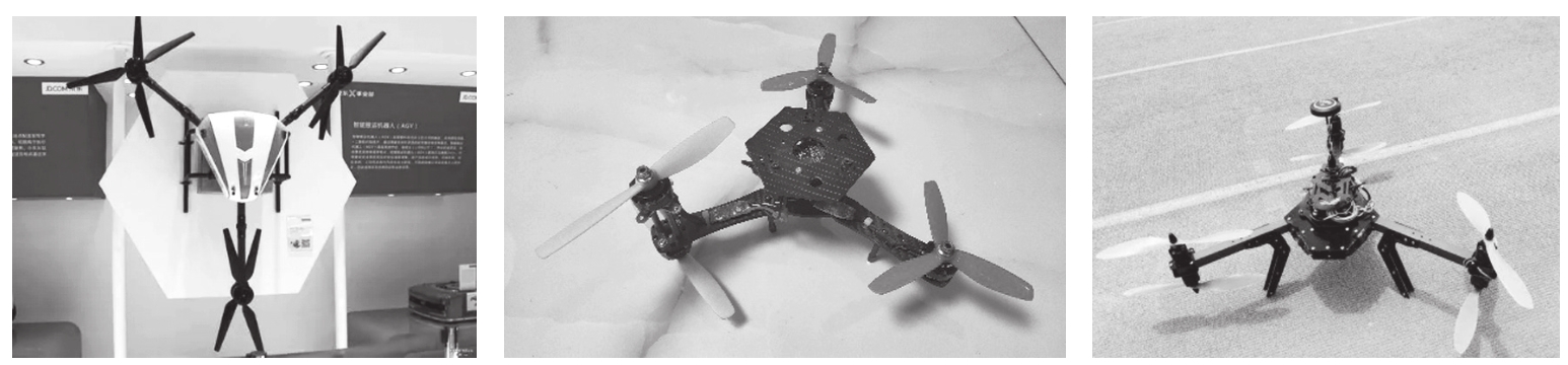 旋翼无人机结构简单,是将电动机直接连接螺旋桨,动力装置带动旋翼,通过改变螺旋桨的速度来改变拉力。旋翼无人机分为半自主和全自主控制方式,前者代表姿态、位置、高度等受控于飞控手,后者则可以完成储存在自驾仪里的预装订任务,飞控手只需要规划任务。固定翼无人机的技术已十分成熟,而旋翼无人机研究起步虽晚,但随着技术发展也可以用于各行各业。旋翼无人机是现如今科研领域中重要的研究对象之一,由旋翼个数不同而有所区分,如图1-35~图1-39所示。