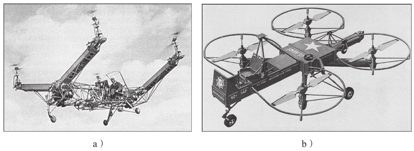 1956年,美国Convertawings公司的D.H.Kaplan研发设计了一架四旋翼飞行器,名为“Convertawings Model‘A’”,如图1-28a所示。这架飞行器的体型和重量庞大,螺旋桨直径达到5.79m,利用两个发电机来驱动四个旋翼,而没有用到尾旋翼,通过改变4个螺旋桨的转速使得每个螺旋桨拉力得到改变,从而控制飞行器姿态。这架飞行器多次成功地实现飞行,因此“Convertawings Model‘A’”飞行器是第一个设计成功的真正意义上能够成功向前飞行的四轴飞行器。