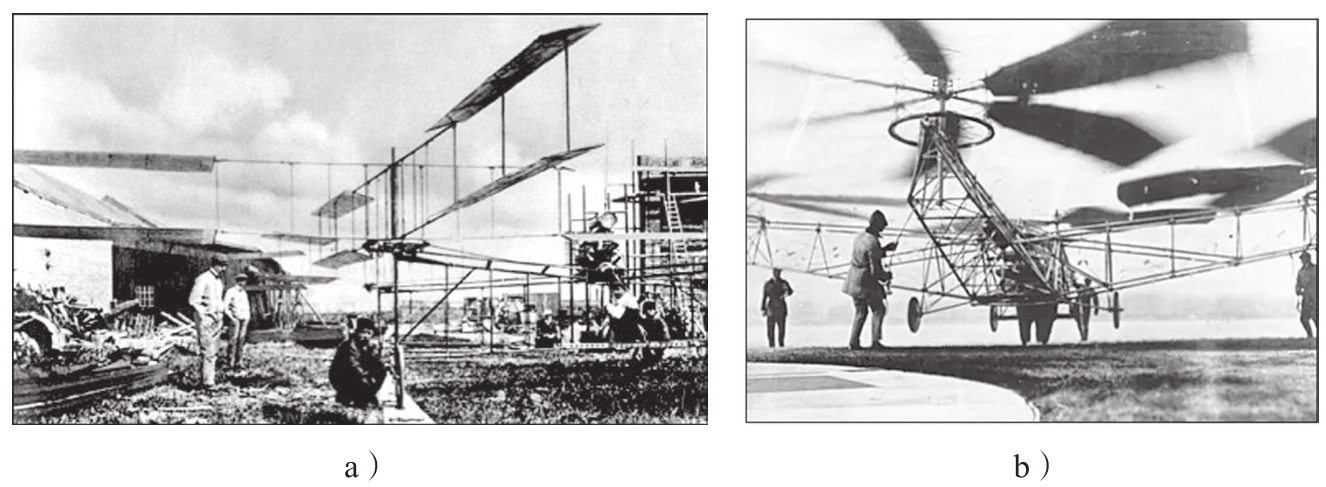 1907年,国外诞生了第一台旋翼式飞行器,名为“Breguet-Richet Gyroplane No.1”,如图1-26a所示。它是由法国Breguet兄弟成功设计,采用了十字架结构,当时飞行器只能达到0.60m,后续经过不断改进,最高达到过4.50m,但飞行时间受到限制,且无法实现飞行的稳定性和自主性,但具有第一次载人旋翼飞行器成功飞行的重要意义,这也为后续研究发展奠定重要意义。
