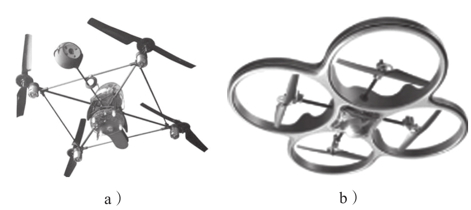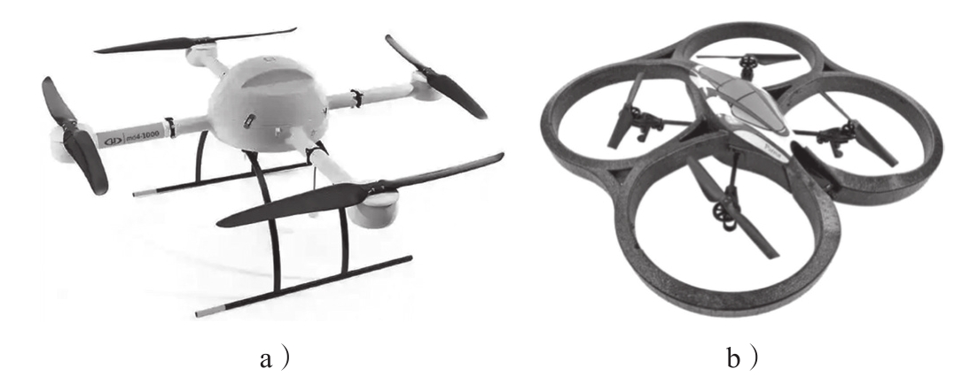 2006年,德国Micro drones GmbH推出的Md4-200四旋翼飞行器,这是一种垂直起降微型自动驾驶无人机飞行器系统,可执行拍摄、搜索、测量、侦察等多种空中任务。机体和云台完全采用碳纤维材料,自重仅700g。该公司在2010年又推出了MD4-1000,如图1-31a所示,相比于MD4-200型,拥有更大的任务载荷、更强的抗风能力、更长的续航时间等。